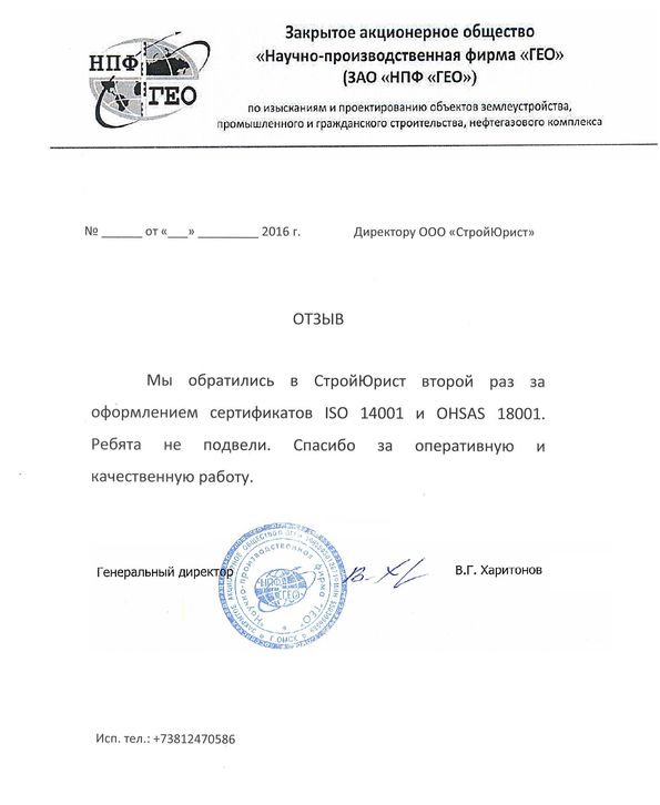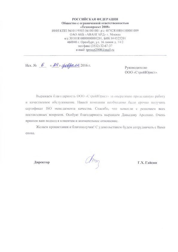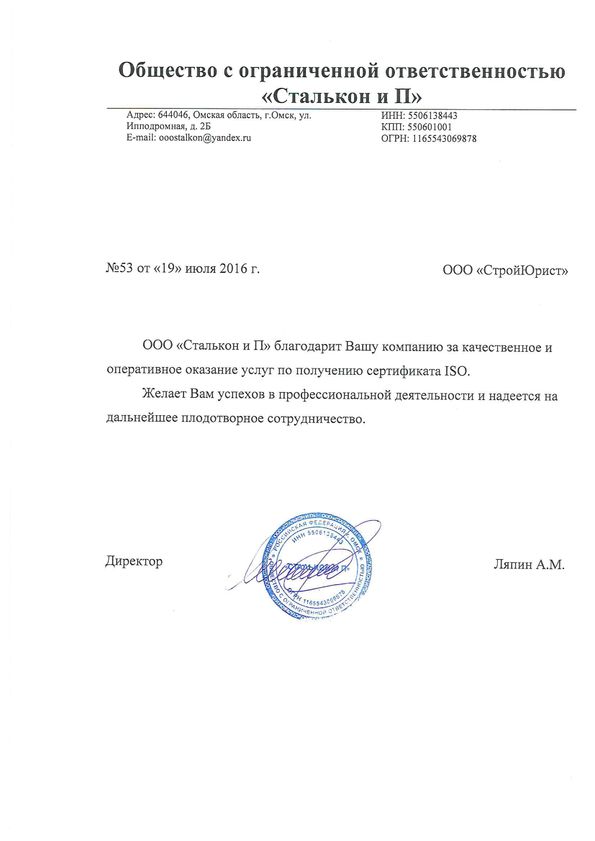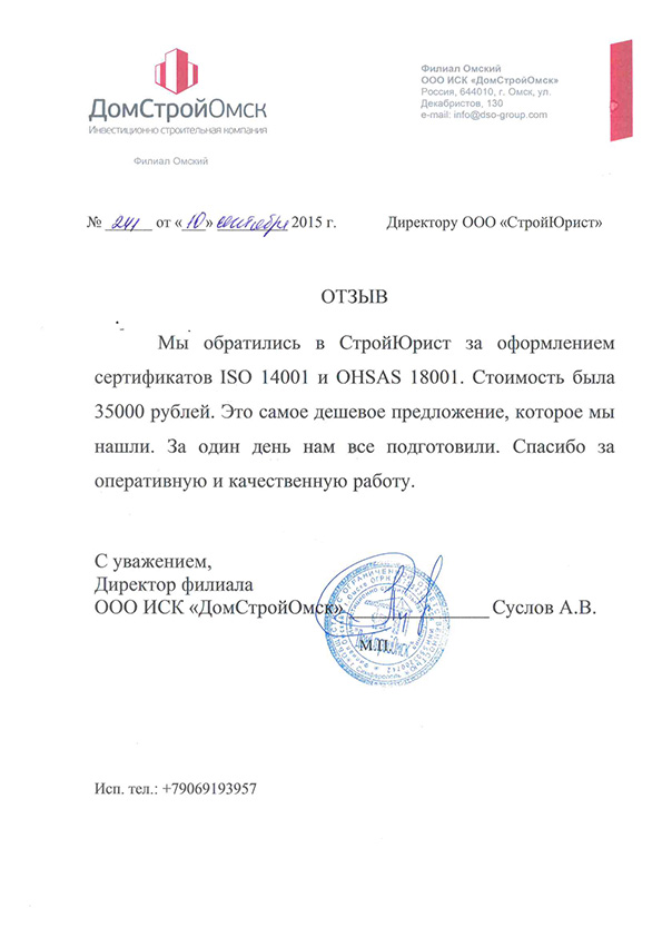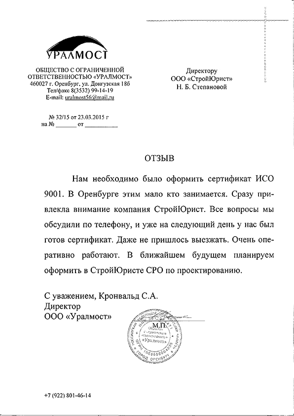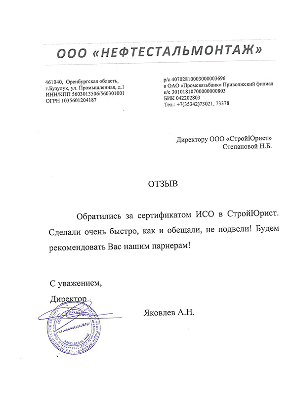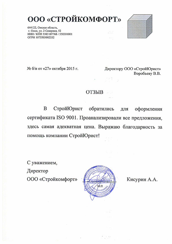 Отзывы клиентов "СтройЮрист" по ISO в Калининграде