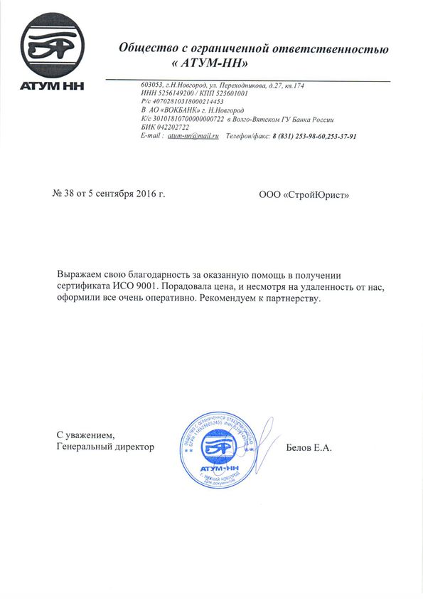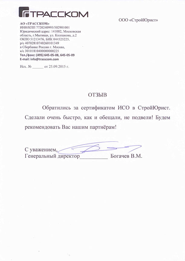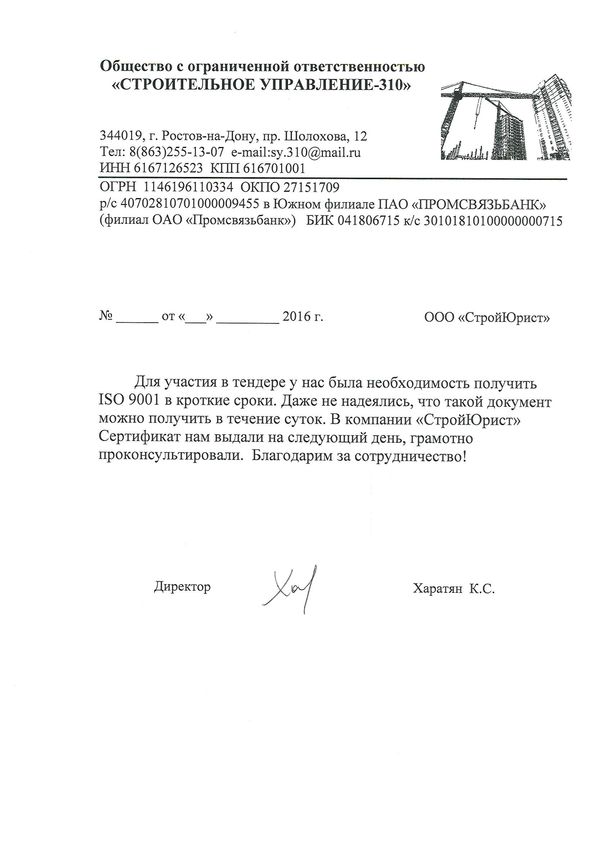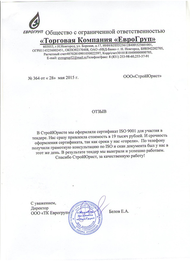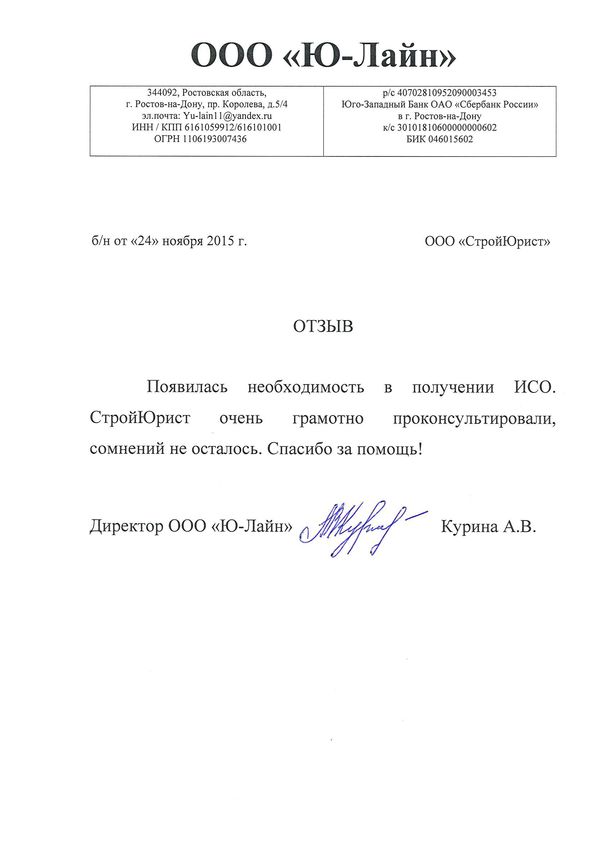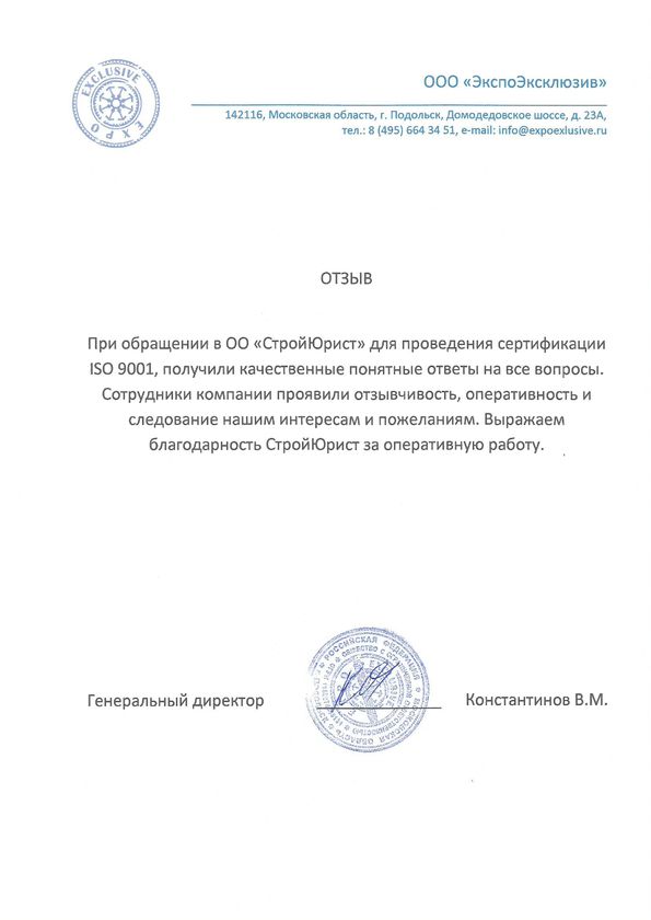 Отзывы клиентов "СтройЮрист" по ISO в Калининграде