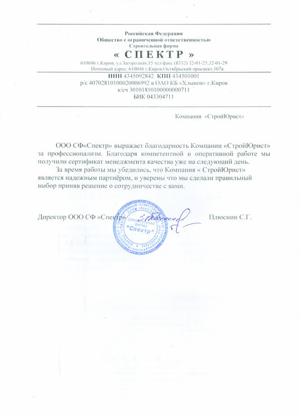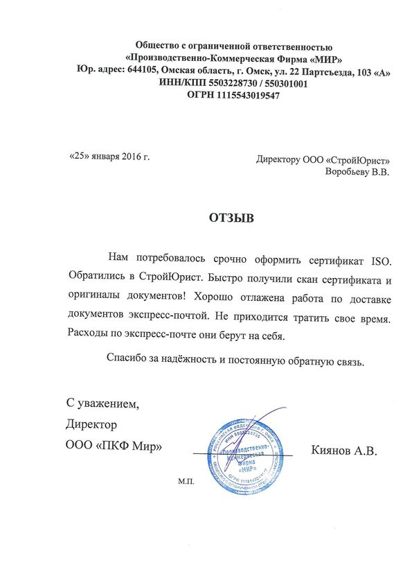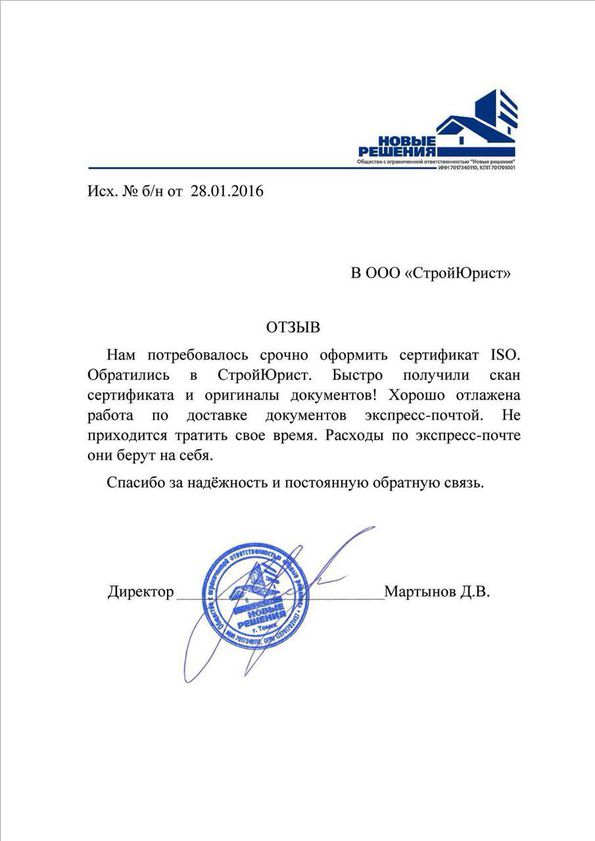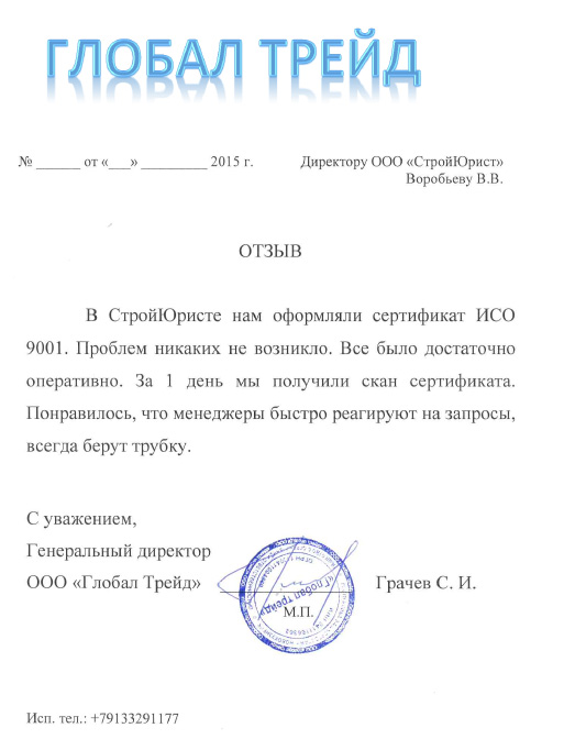 Отзывы клиентов "СтройЮрист" по ISO в Калининграде